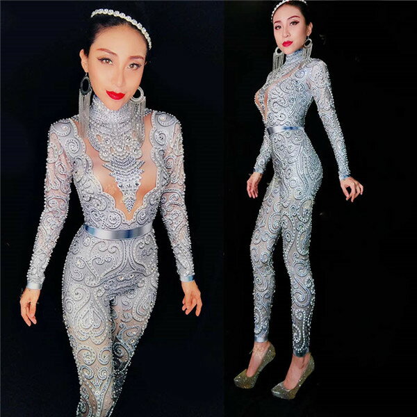 エキゾチックダンスウェア レオタード 着ぐるみ クリスタル ラインストーン 女性用 性能 長袖 スパンデックス ナイトクラブジャンプスーツ クラブコスチューム 女性用 性能 スパンデックス ラインストーン